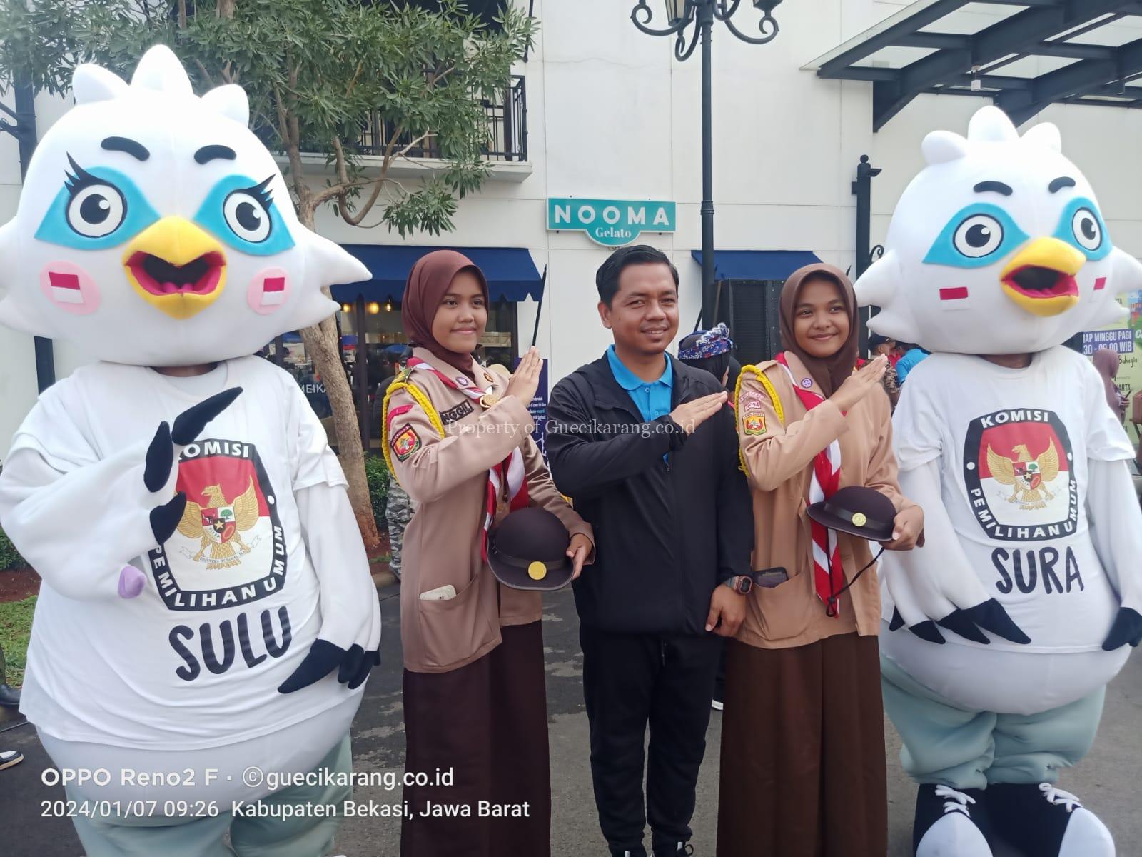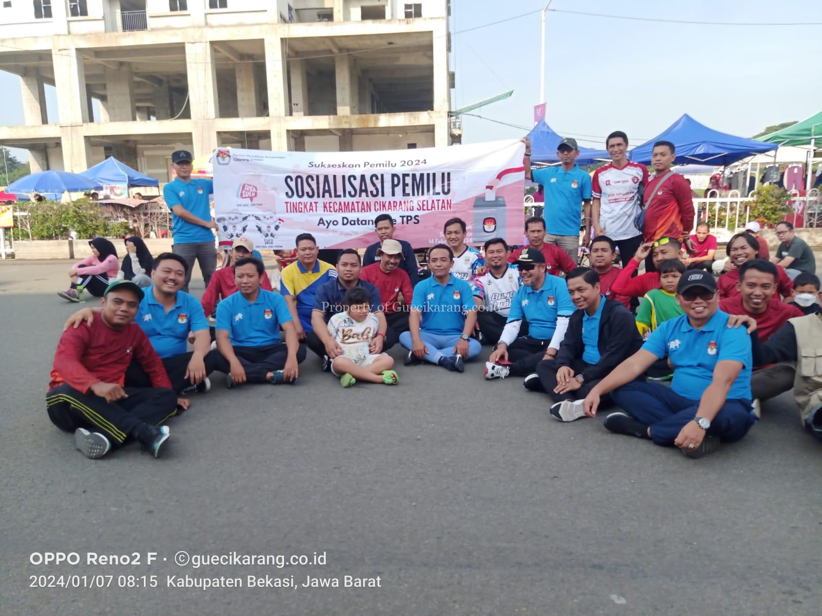 CIKARANG SELATAN – Komisi Pemilihan Umum (KPU) Kabupaten Bekasi mensosialisasikan tahapan Pemilihan Umum (Pemilu) 2024 di acara Car Free Day (CFD) Distrik 2 Meikarta Lippo Cikarang, Desa Cibatu, Cikarang Selatan, Minggu (7/1/24).