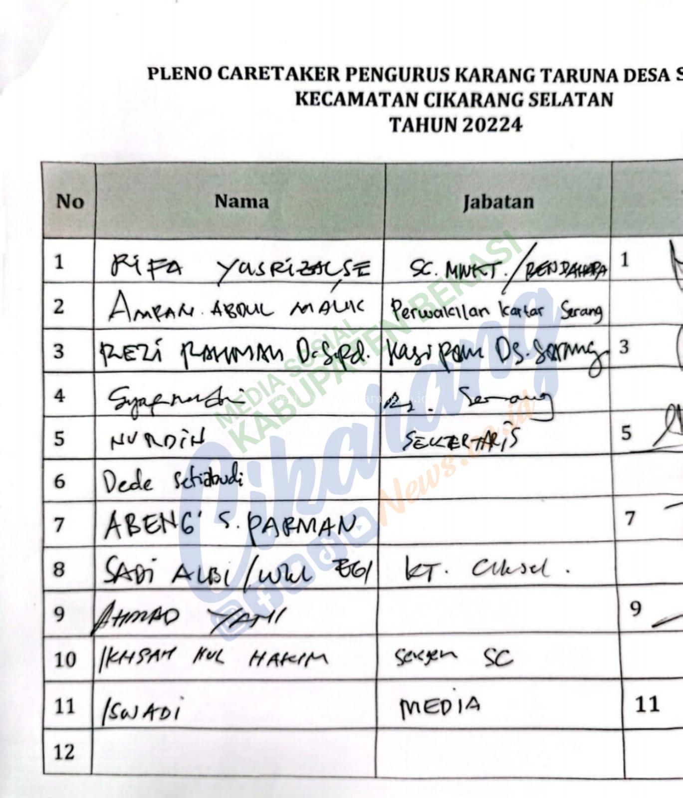 Rapat Pleno Caretaker Pengurus Karang Taruna Desa Serang ini dipimpin langsung oleh Ketua Karang Taruna Kecamatan Cikarang Selatan, Bpk. H. Omin Susanto, Caretaker pengurus Karang Taruna Desa Serang/Panitia Pelaksana MWKT Desa Serang masa bakti 2024-2029, dan perwakilan pemerintah desa serang.