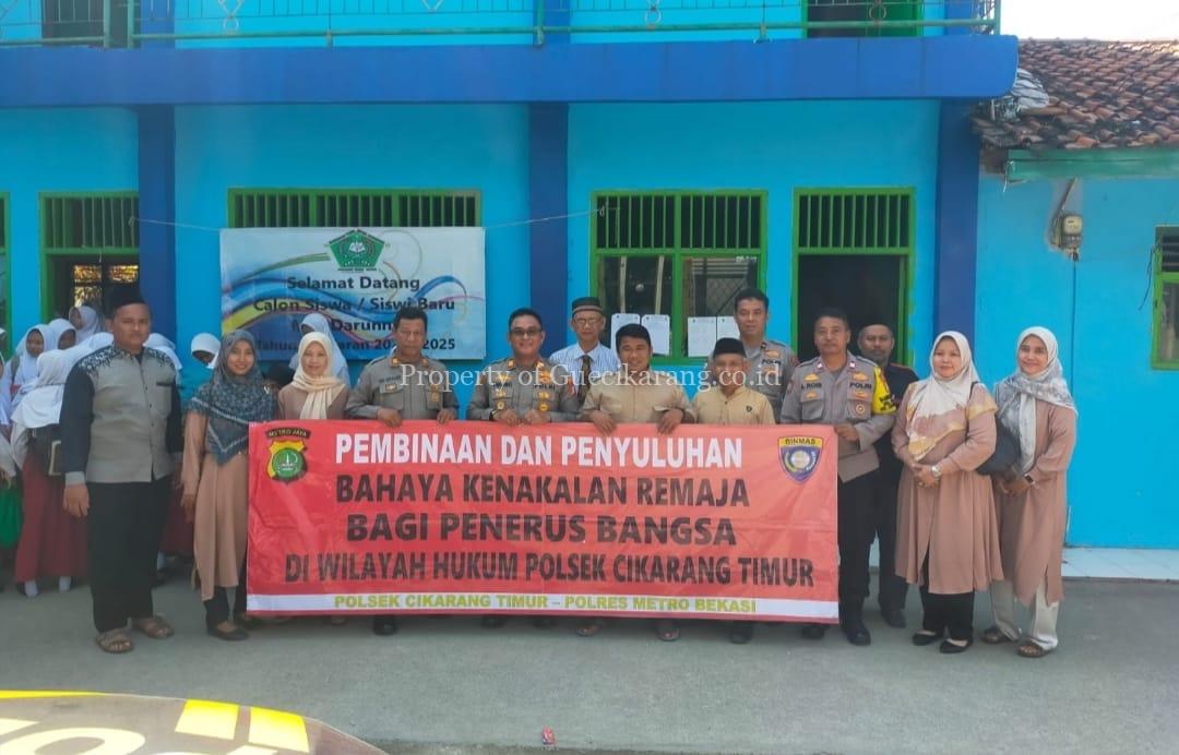 BEKASI,guecikarang.co.id – Polsek Cikarang Timur Polres Metro Bekasi melaksanakan giat Police goes to School dalam rangka Pembinaan dan penyuluhan bahaya kenakalan remaja bagi penerus Bangsa serta bahaya penyalahgunaan Narkoba di Madrasah Tsanawiyah Darunnida, Jalan Raya Citarik RT 08/03 Desa Karangsari Kecamatan Cikarang Timur.Kamis (11/07)