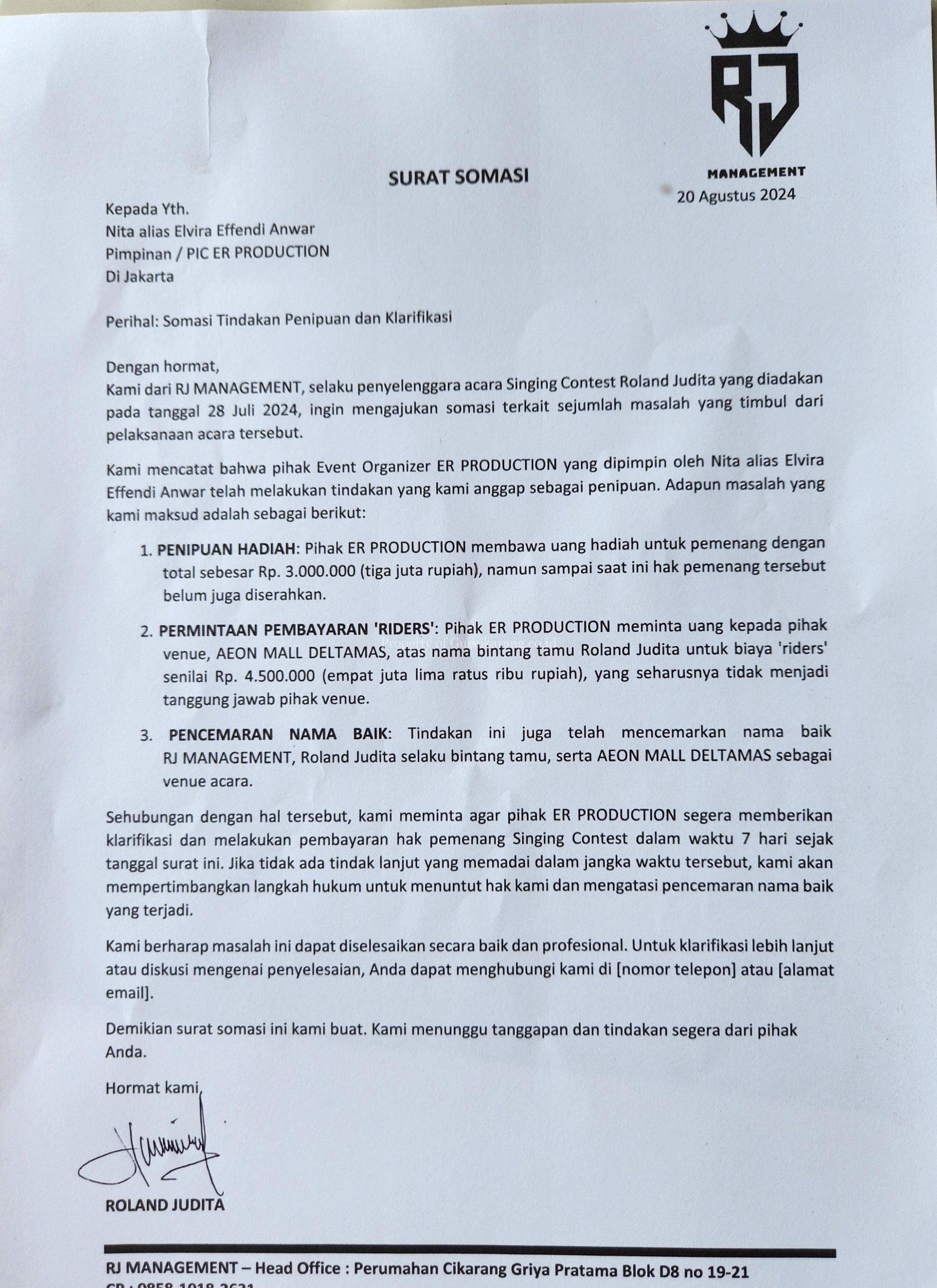 Meski begitu, Pihak RJ Management dan Roland Judita melayangkan surat Somasi kepada ER Production sebagai bentuk peringatan kepada oknum tersebut agar bisa bertanggung jawab.