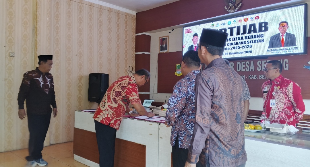 Cikarangang Selatan – Pemerintah Desa Serang, Kecamatan Cikarang Selatan, menggelar kegiatan Rapat Minggon sekaligus Serah Terima Jabatan (Sertijab) Sekretaris Desa, pada Kamis (6/11/2025), bertempat di Aula Balai Desa Serang. Acara dimulai pukul 09.00 WIB