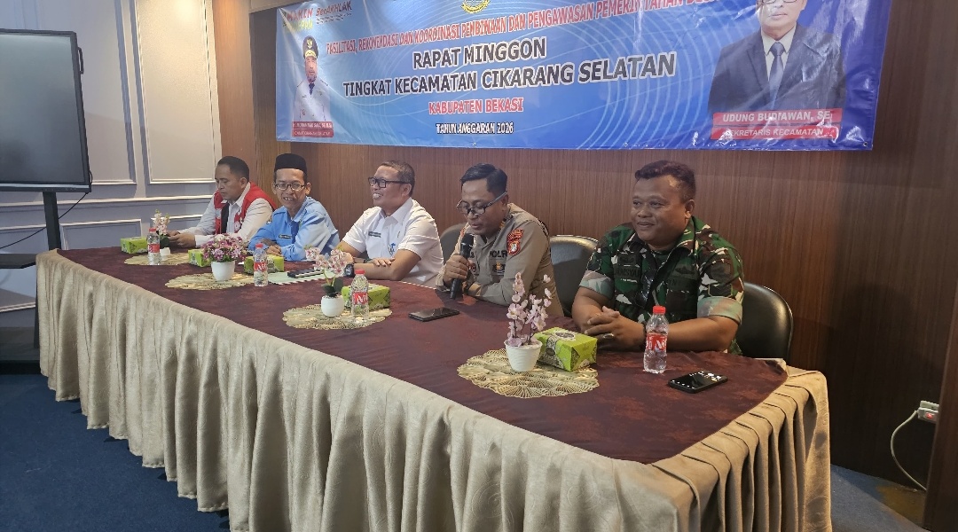 Kabupaten Bekasi – Rapat Minggon tingkat Kecamatan Cikarang Selatan kembali digelar sebagai forum koordinasi rutin lintas instansi, Rabu (22/4/2026). Kegiatan berlangsung di ruang rapat lantai 3 Kantor Kecamatan Cikarang Selatan dan dihadiri unsur pemerintahan, TNI-Polri, tenaga kesehatan, serta elemen masyarakat.
